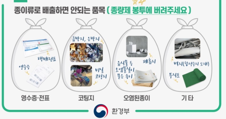 그래서 혹시 모르고 지나쳤을 종이쓰레기 분리배출 방법 알아보았습니다. 종이질감이면 다 종이쓰레기 라고 생각했는데 이것이 이래저래 다 다를 수 있다고 합니다.