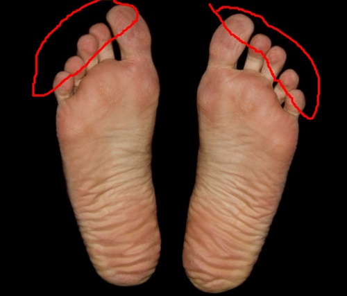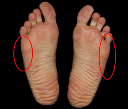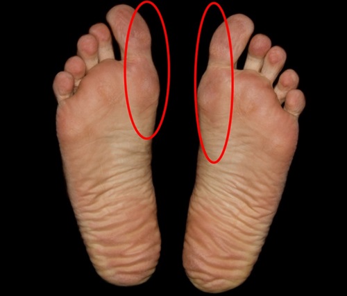 새끼발가락 쪽 발바닥 면에 굳은살 많이 있는 경우는 O자 다리로 걷고 있을 확률이 높습니다. 그리고 안짱다리, 무지외반증인 사람도 이 쪽에 각질이 많이 생깁니다. 새끼발가락 쪽이 딱딱하고 발톱이 정상적이지 않습니다.