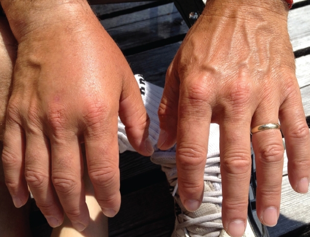우선 첫번째로는 손이나 발을 좌우 비교해 봅니다. 한쪽만 굵어 보인다면 붓기 이고 양쪽이 똑같다면 이것은 비만입니다.