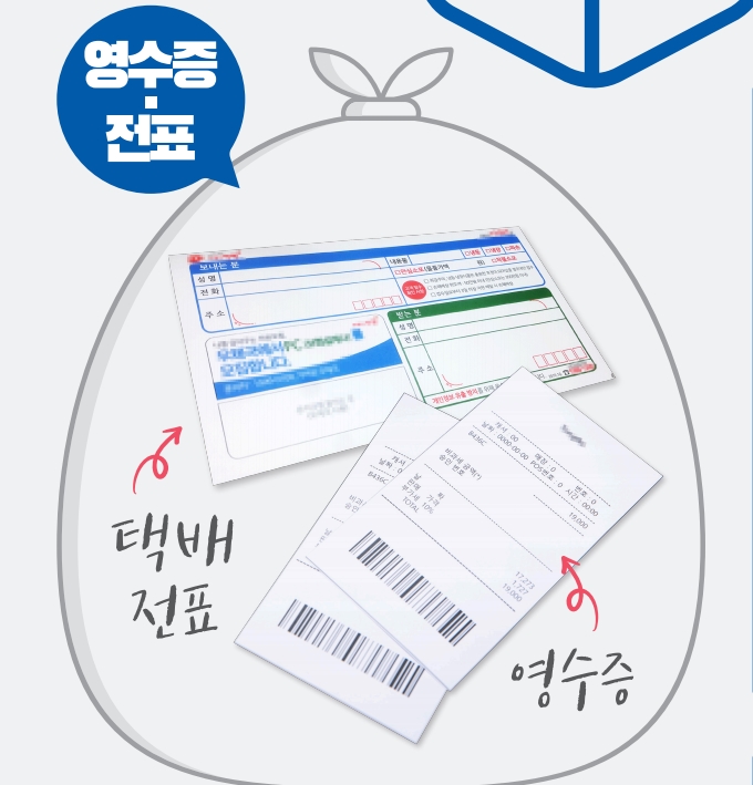 그리고 이것도 종이쓰레기 아니었던 거야? 하고 놀랐던 것은 영수증과 전표, 각종 라벨 등이었습니다. 뒷면이 매끈매끈한 것이 일반 종이와는 좀 다르다 생각했지만 이것은 종이쓰레기 분리배출 대상이 아니라 종량제 봉투에 버려야 합니다.
