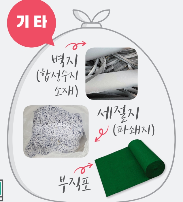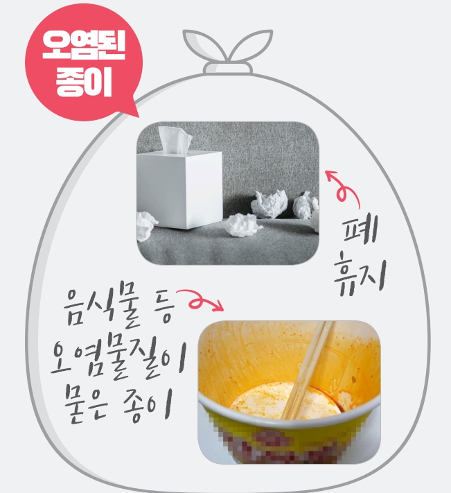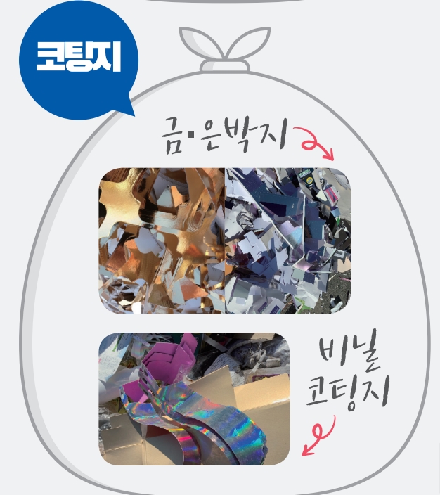 또한 금박, 은박, 알루미늄, 비닐코팅지, 명함, 사진, 방수코팅된 포장박스 등도 종이쓰레기 로 분리배출 할 수 없습니다. 또한 폐휴지나 기저귀 그리고 오염된 종이 또한 종량제 봉투로 분리배출합니다. 두말할 것도 없이 부직포와 벽지 등도 종이쓰레기 아닙니다.